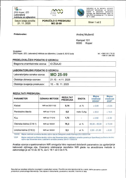 Na voljo je vrhunsko ekstra deviško oljčno olje iz letošnje letine. Olje je višje kategorije, kar potrjujejo tudi rezultati kemijske in organoleptične analize (priloženi v galeriji). Po vseh parametrih sodi v kakovostni razred ZOP.