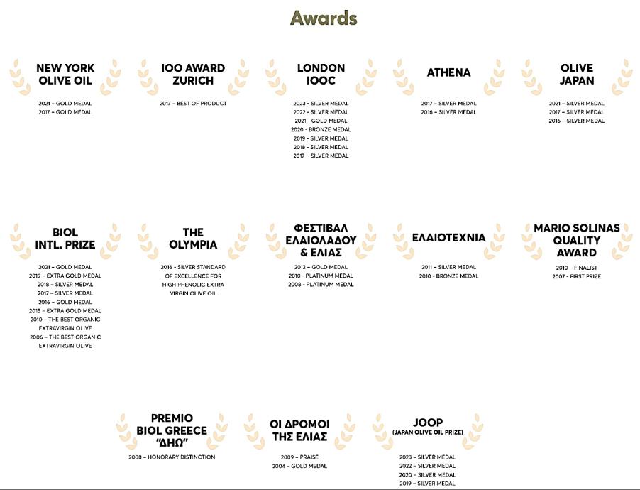 Ekstra deviško oljčno olje Aegean Gold je prejelo več kot 40 priznanj na mednarodnih sejmih in razstavah v Grčiji, Italiji, ZDA, na Japonskem, v Veliki Britaniji in Švici.