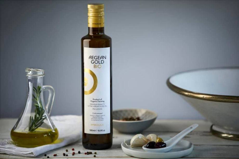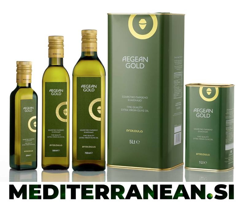 Ekstra deviško oljčno olje Aegean Gold je filtrirano oljčno olje višje kategorije, pridobljeno neposredno iz ročno izbrane mešanice oljk in izključno z mehanskimi sredstvi.