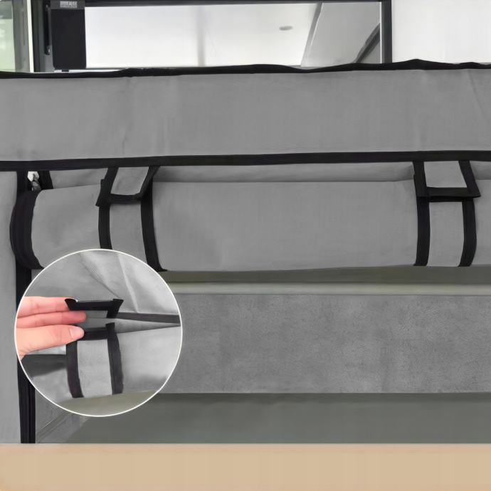 Na sprednji strani omare je tekstilna prevleka za zvijanje z dvema zadrgama , zahvaljujoč kateri lahko enostavno vstopite vanjo in hkrati zaščitite svoja oblačila pred prahom, svetlobo in očmi gostov!