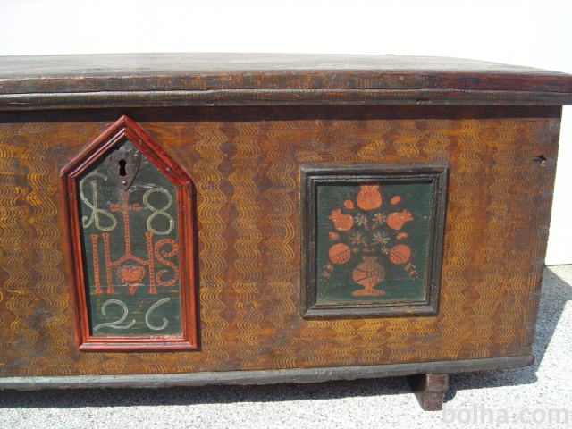 **V CELOTI STROKOVNO RESTAVRIRANA**ORIGINAL POSLIKAVA l.1826!! GORENJSKA KMEČKA SKRINJA IZ SELŠKE DOLINE, PRIMERNA ZA OPREMO KMEČKE HIŠE ALI MODERNEGA STANOVANJA ZA POŽIVITEV IN ČAR DOMAČNOSTI.