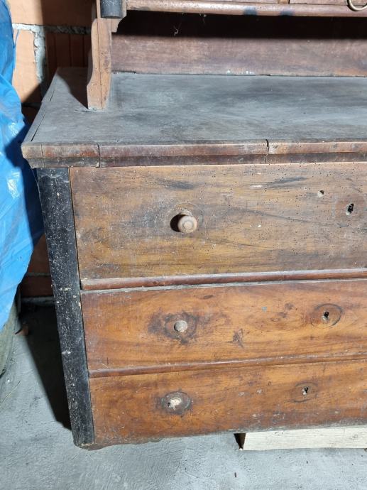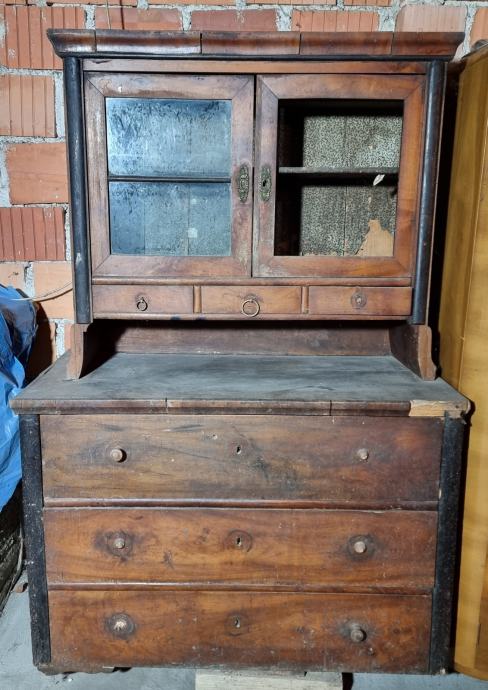 Dobro izdelana in lepo oblikovana. Zgoraj vitrina in tri predala, spodaj tri velika predala. Tipična slovenska kredenca s štajerskega konca. Pred leti je bila že tretirana za lesne črve in zaščitena za naprej 100%. Potrebno jo je restavrirati. Za ljubitelja. Cena simbolična 90€. Mene je stala do sedaj okoli 600€...žal so danes časi drugačni.