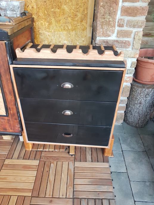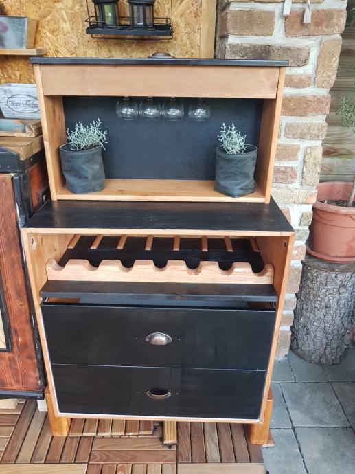 Masiva. Lahko je v dveh postavitvah. S predalom ali kot vinska komoda. Mere