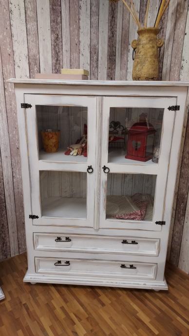 Komoda ima spodaj dva predala in je iz masivnega bora, barvanega v belo patino.