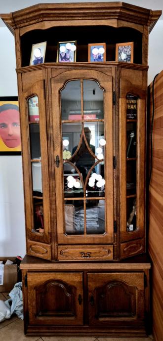 1.VITRINA ima ključavnico, ki deluje, steklo, luč znotraj vitrine, polni les in iverica (iverica levo in desno je zaradi stabilnosti proti zvijanju lesa),