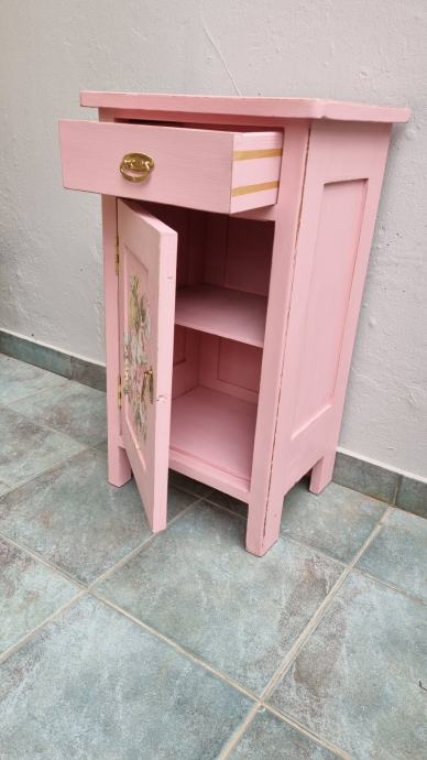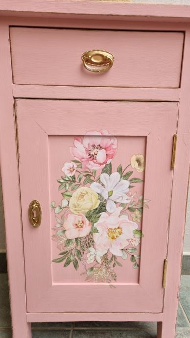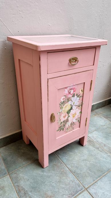 Unikatno starinska ročno prenovljena omarica z aplikacijo rož. Prebarvana z ekološko kredno barvo in zaščitena z naravnim čebeljim voskom. Zaradi zaščite se omarica (vključno z aplikacijo) lahko čisti z vlažno krpo. Na vrhu je steklena površina, ki omogoča boljšo zaščito tudi za odlaganje skodelic, kozarcev ipd.