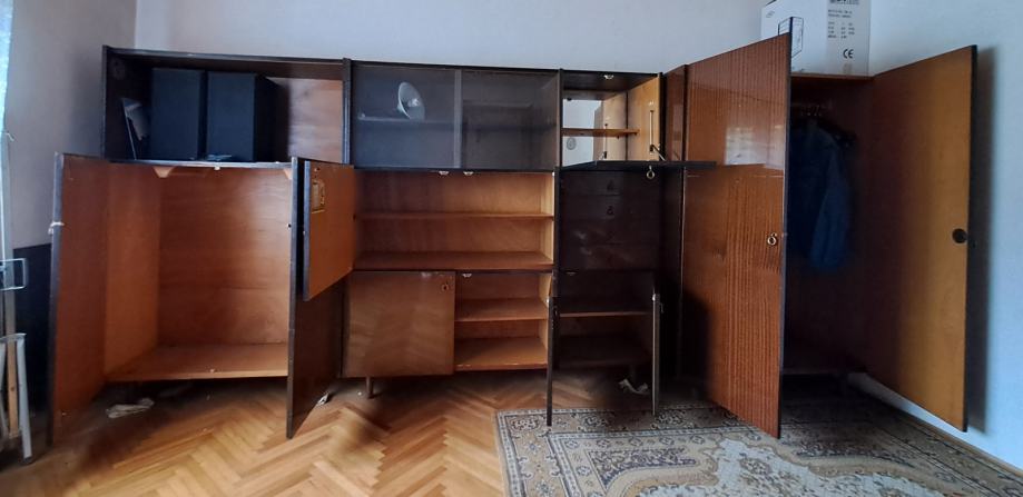 Prodam omare, lahko posamično ali v kompletu. Vse omare so višine 170 cm. Širina leve brez stekel je 109 cm in globine 42 cm, širina sredinske s steklom in barom je 163 cm in globine 42 cm, garderobna omara je široka 109 cm in globoka 59 cm.