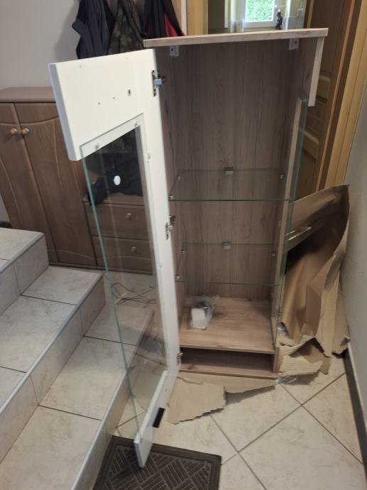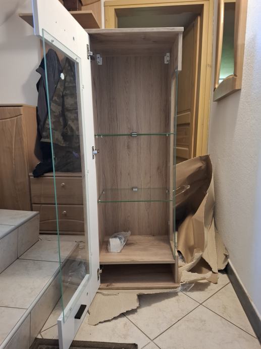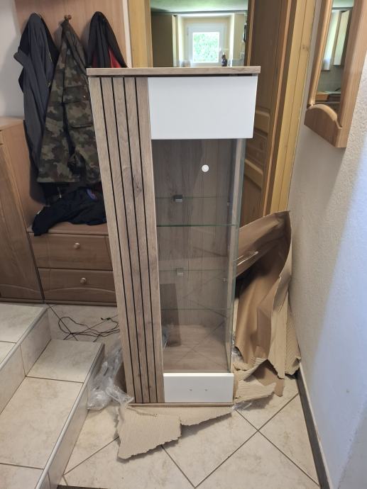 Prodam novo stensko omaro primerno za dnevno sobo. Dimenzije: V: 1284mm, Š:450mm, G:374mm. Vgrajena je tudi dekorativna luč.