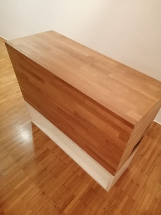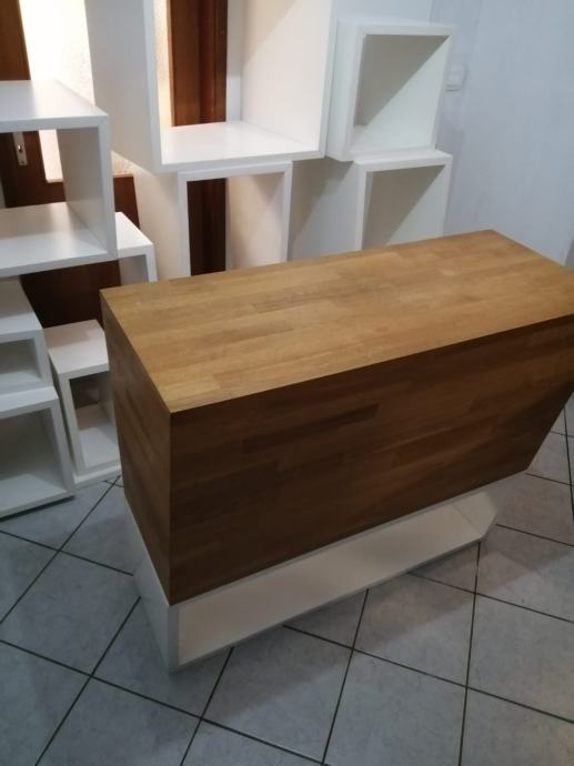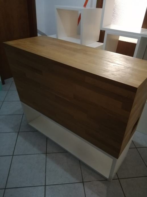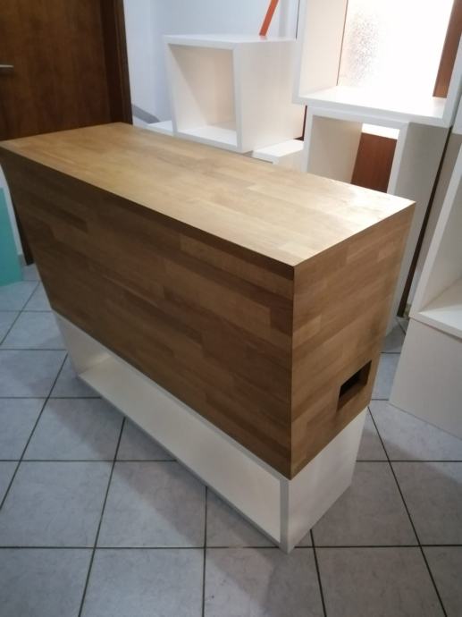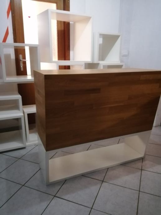 Ima dva predala in omarico, spodaj podnožje, belo mat lakirano, višine 35 cm - pult je torej skupaj visok 95 cm