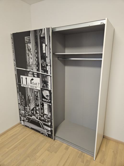Prodam praktično novo omaro dimenzij 170 x 190 x 60 cm, dvodelna, z drsnimi vrati v belo-črni kombinaciji z atraktivno grafiko New Yorka.