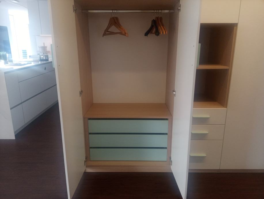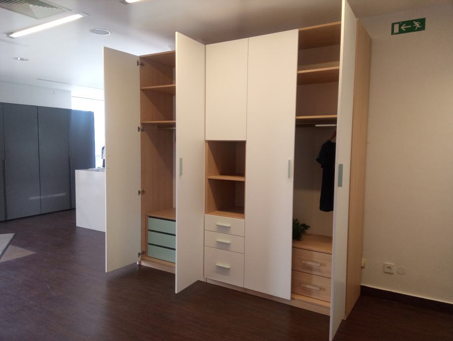 V prodaji je razstavni eksponat sestava garderobnih omar, vključno z notranjima predalnikoma; korpus in police iveral beljen hrast, fronte strukturni mat lak bele barve in lakirani leseni ročaji. Sklop omar je na ogled v salonu na Župančičevi ulici 18 v Ljubljani. Po dogovoru ga razstavimo in pripravim za prevzem, transport in montažo pa uredi kupec.