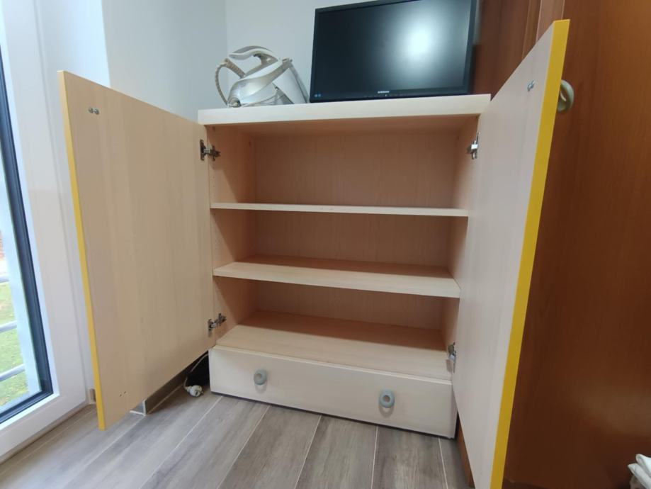 1. KOMODA, večja (rumena), 1x dvojna vrata, 3 police in en predal (velikost: višina: 103 cm, širina: 87,3 cm, globina: 37,5 cm). Cena 100€.