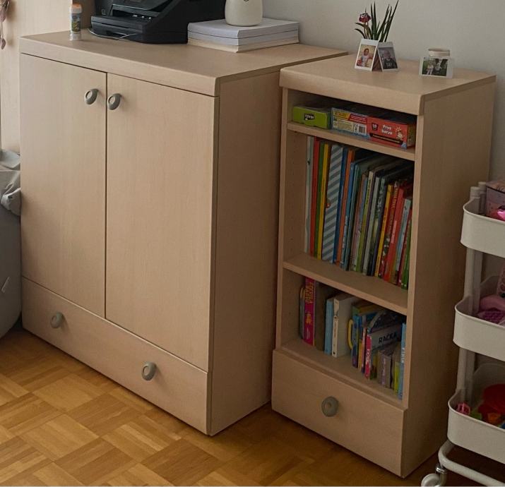 Omara: širina 60cm, višina 103 cm in dolžina 87cm. Omara ima tri police in en predalnik.