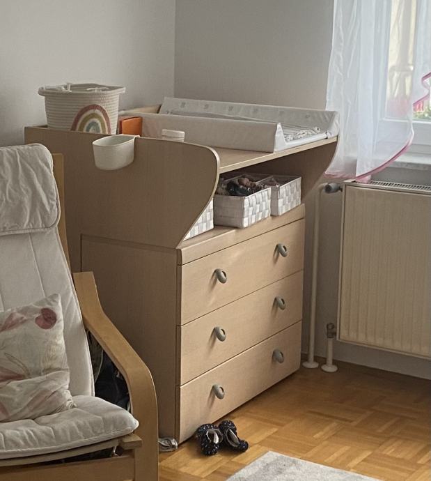 Previjalna miza (predalnik): širina 72cm, dolžina 78cm in višina 97 cm. Kasneje se lahko previjalna odstrani in ostane samo predalnik širine 38 cm.