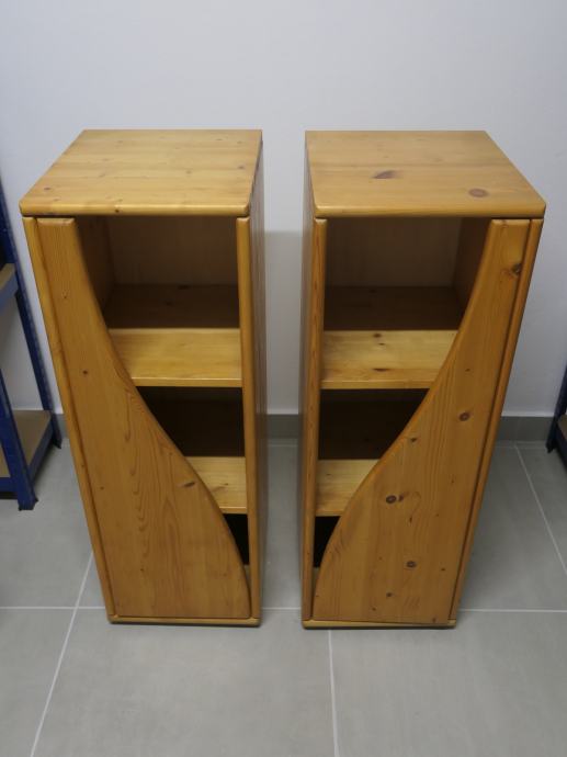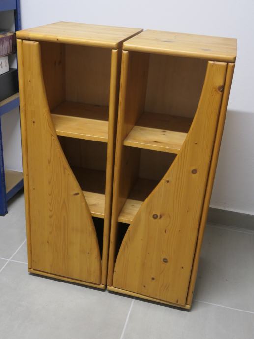 Lepo ohranjeni in nepoškodovani pokončni omarici iz smrekovega lesa s polodprtimi vratci. Dimenzije vsake omarice so: širina 36 cm, globina 40 cm, višina 103 cm (skupaj z okroglimi plastičnimi nogicami). Cena velja za komplet.