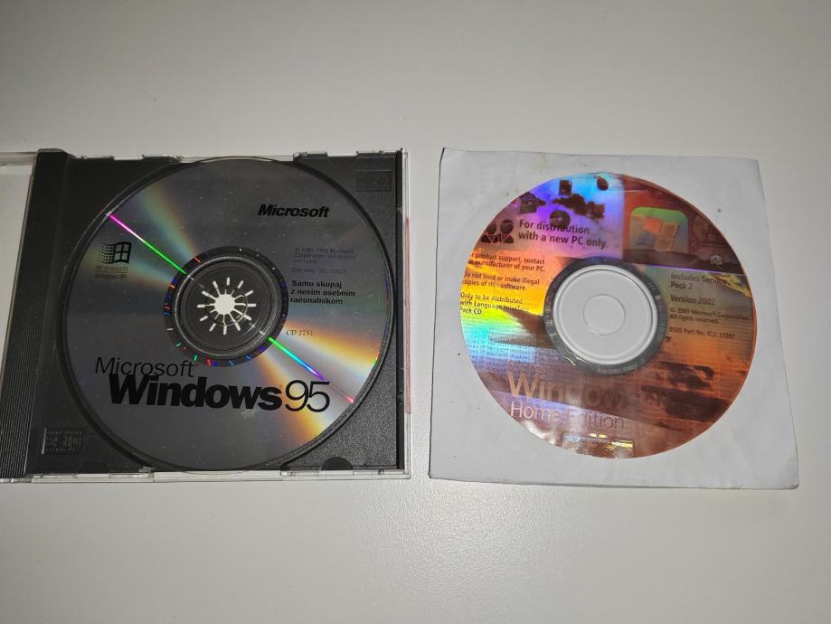 Prodam namestitvena CD-ja za windows 95 in XP home. Poleg CD-ja za win95 je tudi ročno zapisan licenčni ključ, winxp tega ključa nima.