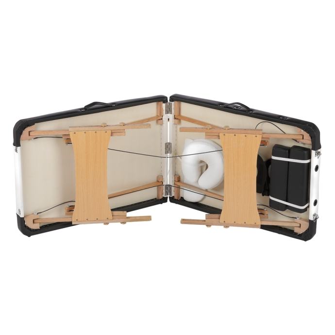 Zložljiva masažna miza je še posebej primerna za mobilne masažne ponudbe, saj jo je mogoče shraniti na prostorsko varčen način in enostavno prenašati. Po višini nastavljiva masažna miza nudi maksimalno udobje. To je predvsem posledica 5 cm debele podloge z zaobljenimi in podloženimi robovi. Vse skupaj dopolnjujeta ergonomski večnamenski vzglavnik in naslon za roke.