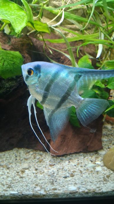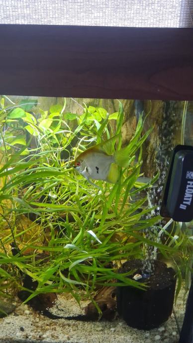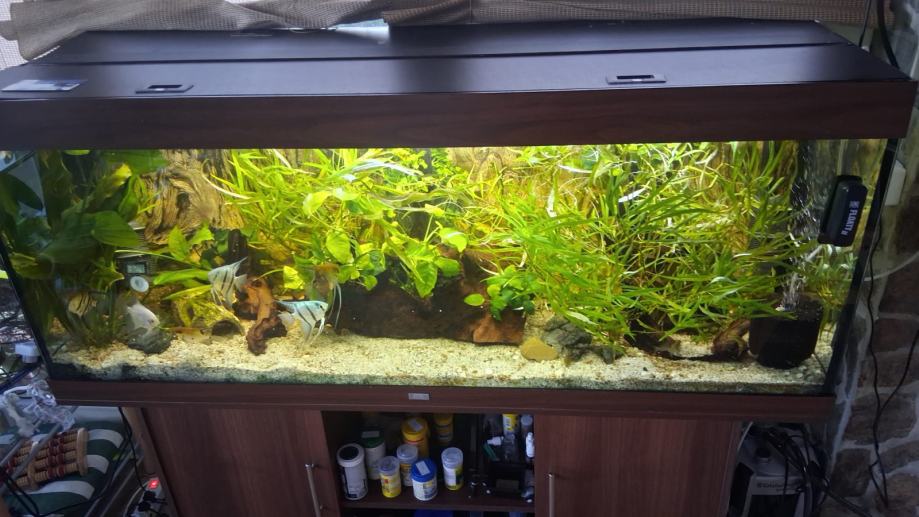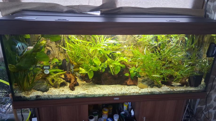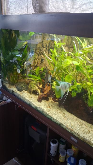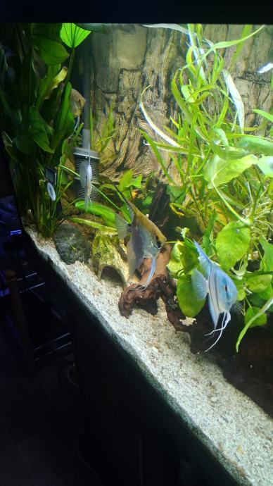 Na prodaj je akvarij 450 litrov z ribami zelenjem,dekoracijo in ozadjem 3D