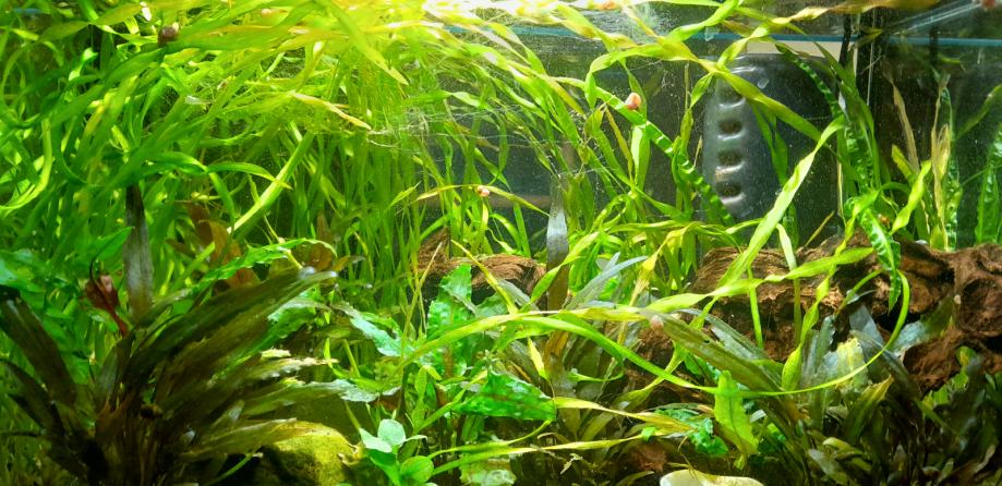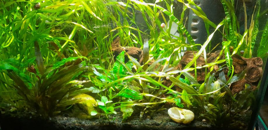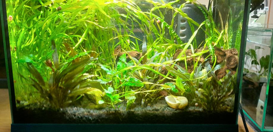 prodam polno zaraščen akvarij brez rib, star 2 leti. 30L, 30x20x45. Rastline odlično uspevajo, občasno pa ima nekaj nitastih alg(opazno na sliki), ki se brez težav ročno odstranijo. Notri je akvarijska korenina, kamen, svitki, valisneria, cryptocoryne wendtii green, cryptocoryne wendtii brown, in še kaj. Filter: Aquael filter ASAP 300 EU, akvarijska žarnica.
