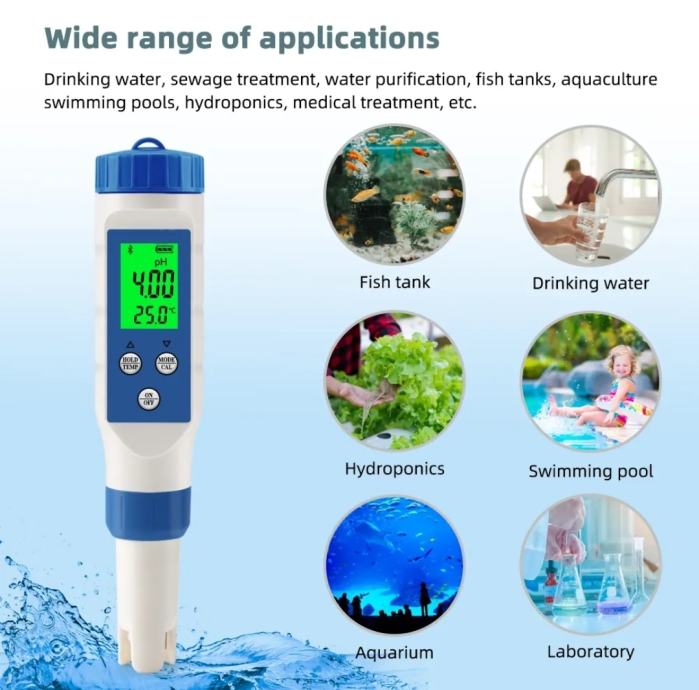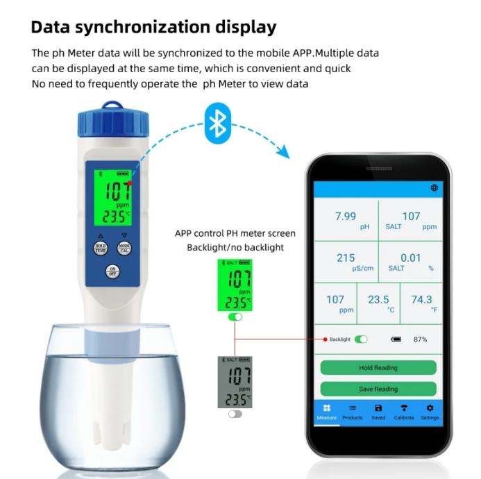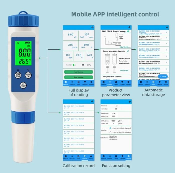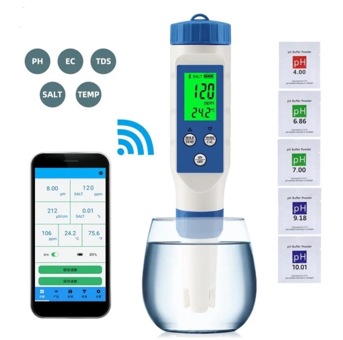 NOV, 5v1 profesionalni digitalni pH TDS EC meter merilec merilnik tester pH meter merilec kvalitete pitne vode analizator slanosti vode digitalni pH meter bluetooth pH merilnik EC meter EC merilec elektroprevodnosti TDS merilec kvalitete in trdote vode merilec zakisanosti telesa salinometer z brezžično Bluetooth povezavo z mobilnimi telefoni ali tabličnimi računalniki.