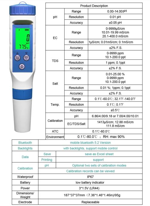 Digitalni BLUETOOTH pH meter merilec kvalitete (pitne) vode vam omogoča profesionalno merjenje in analizo vode PH/TDS/EC/SLANOSTI/TEMP (℃/℉).