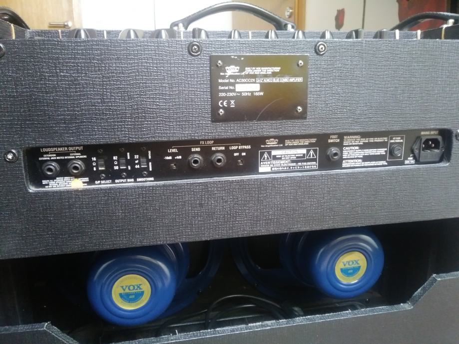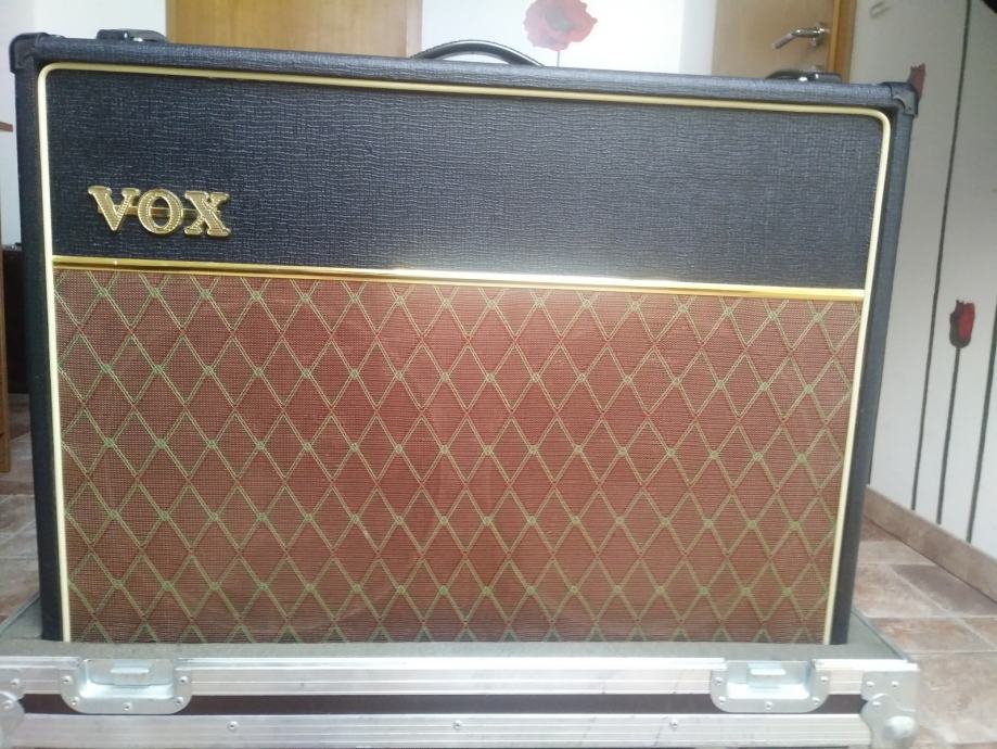 Vox AC30 CC2X, letnik 2007, z izrednima BLUE BULDOG 2x12" zvočnikoma (en zvočnik pri Thomannu 280 eur). Ampu pripada tudi profesionalni Flight case na kolesih za transport (vrednost 250 eur), v katerem je bil vedno hranjen, zato tudi odlično ohranjen. Lampe menjane pred leti, vendar potem zelo malo igran.