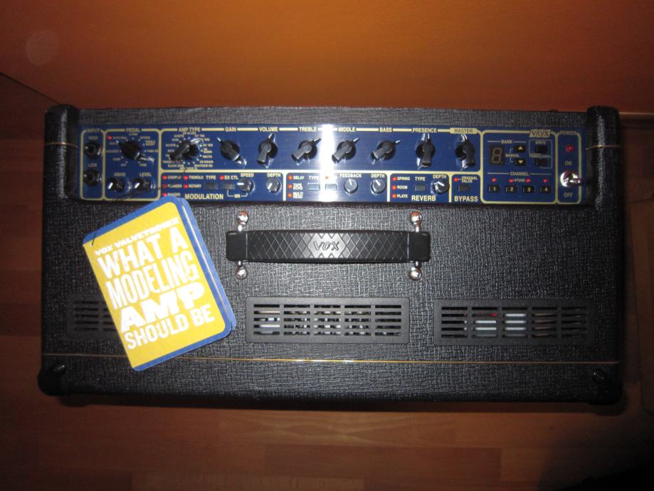 To je eden redkih posrečenih hibridnih ojačevalcev, mešanica med tranzistorjem in lampašem. Ima lampo 12AX7 na predojačevalcu in 1x12" Celestion NeoDog (VOX original). Zato dobi zvok tisto dušo, ki jo rabite pri igranju. Efektov ne potrebujete, saj so vsi efekti že na njem, celo Wah-Wah (pravi Vox-ov) in v kombinaciji z pedalko VC12 je to res vse v enem.