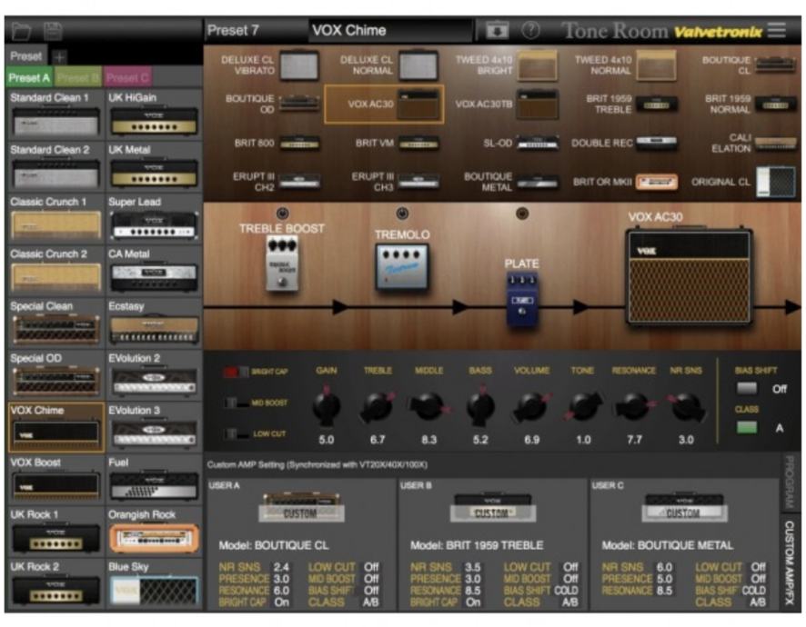 Urejevalnik/ knjižnica Tone Room omogoča prilagajanje ojačevalnikov in učinkov