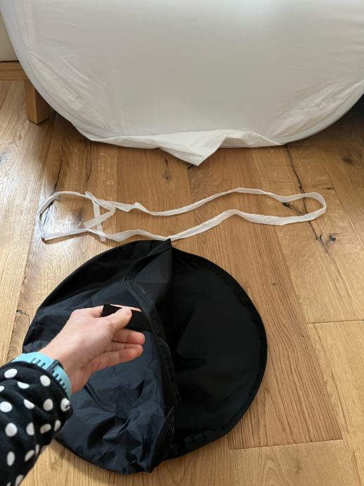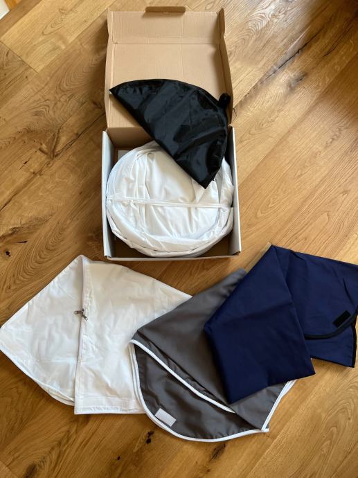 Poleg bele škatle so priložene še tri barvne podloge (bela, siva, modra) ter vreča za shranjevanje bele škatle