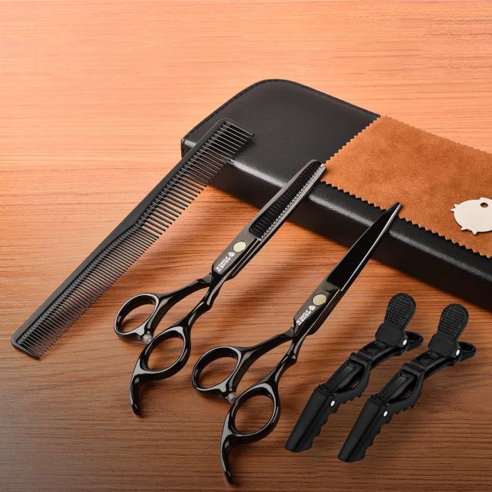 Večnamensko in vsestransko – Our set of brivskih škarij vključuje tako škarje for redčenje, ki so ideal for striženje konic las, kot škarje for striženje, ki so popolne za različne frizerske tehnik. There are also complete dopolnjen s praktičnim glavnikom, ki bo olajšal oblikovanje in natančno ločevanje forest, complete frizerskih sponks in ogrinjalom krpo and with mikrovlaken. Priložimo tudi eleganten ovitek iz imitacije usnja!
