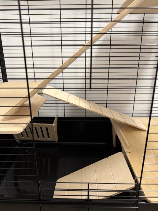 Kletka ima možnost treh nastavljivih nivojev lesenih plošč za optimalno gibanje živali. Ima tri lestve, krmilnico in skrivališče.
