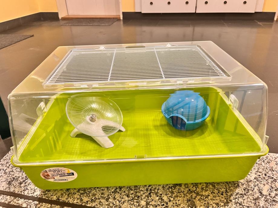 Prodam kletko za hrčka, kot je razvidno na sliki. Priložim še kolo, žogo, hiško, neodprto vrečo stelje, transporter in škatlo prigrizkov. Vsi izdelki so primerni za hrčke vseh pasem, razen žoge, ki je najbolj primerna za roborovske in kitajske hrčke (manjše). Vidni so minimalni znaki uporabe. Vse je očiščeno in razkuženo.