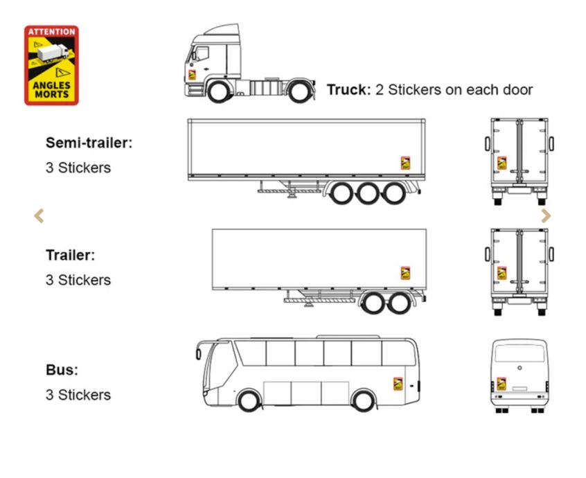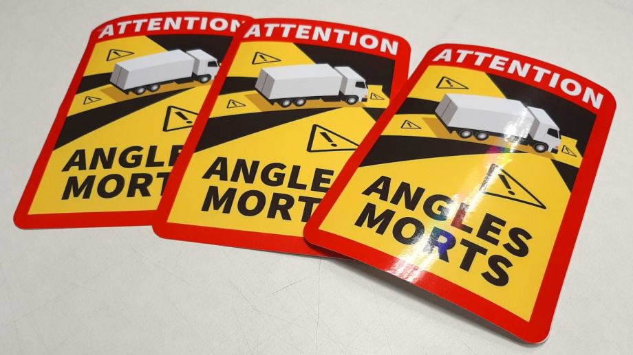 Obvezna nalepka v Franciji od 1.1.2021 za vsa vozila z največjo dovoljeno maso nad 3,5 tone, za opozarjanje pešcev, kolesarjev in drugih cestnih udeležencev na nevarnost mrtvega kota vozila. Nalepke imajo UV 10-letno laminacijo za boljšo obstojnost, ki ustreza vsem predpisom.