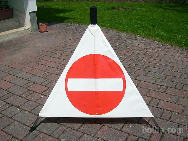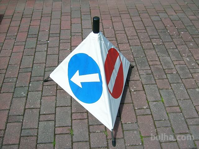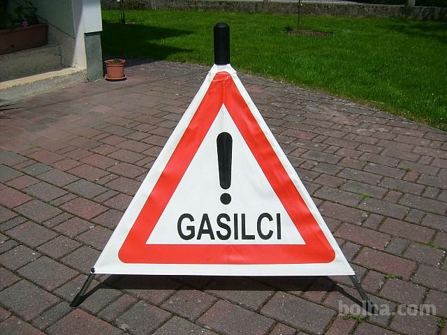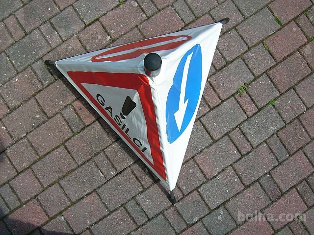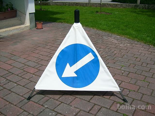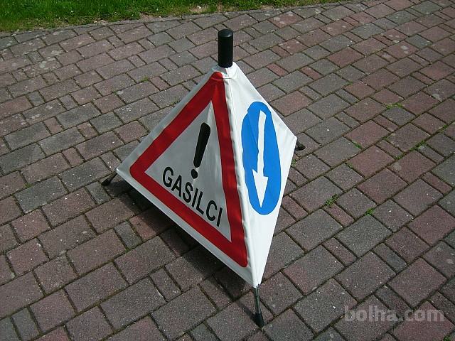 Prodam profesionalni, trikotni opozorilni znak s tremi različnimi opozorili (obvezna vožnja mimo po levi strani, prepovedan promet v eno smer, pozor gasilci).