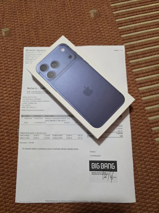 Prodam nov, originalno zapakiran iPhone 17 Pro Max 256 GB, temno modre barve.