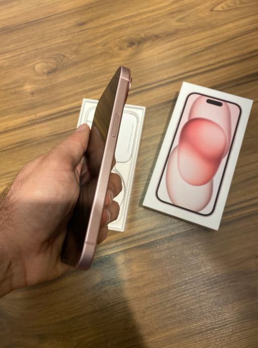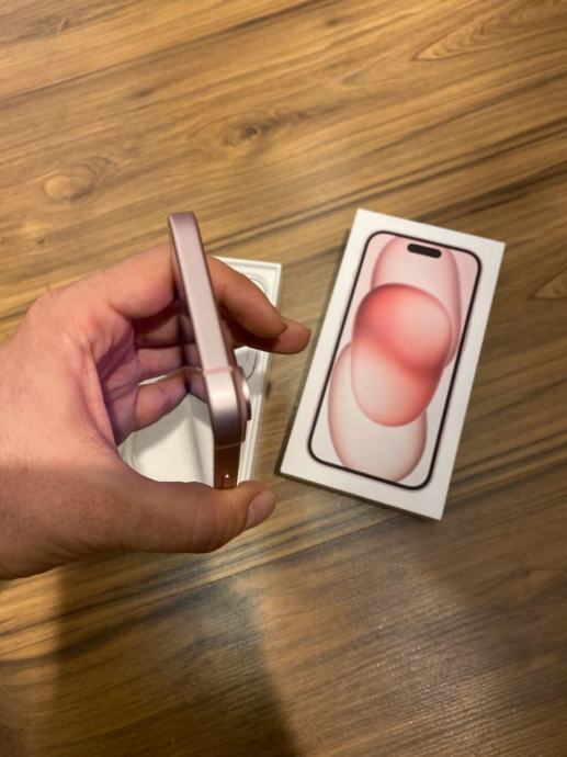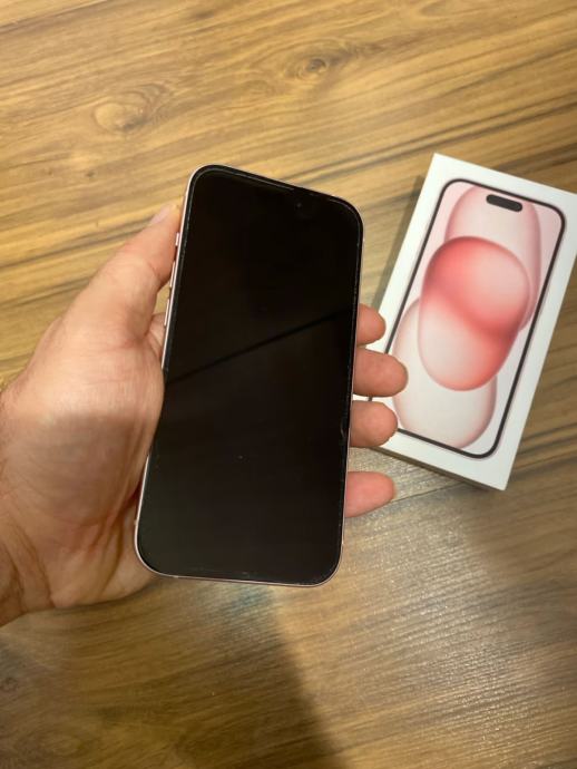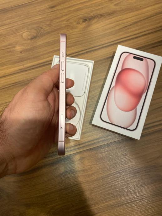 iPhone 15 (128 GB) v roza barvi. Kot nov, 97 % stanje baterije. Telefon je brez znakov uporabe.