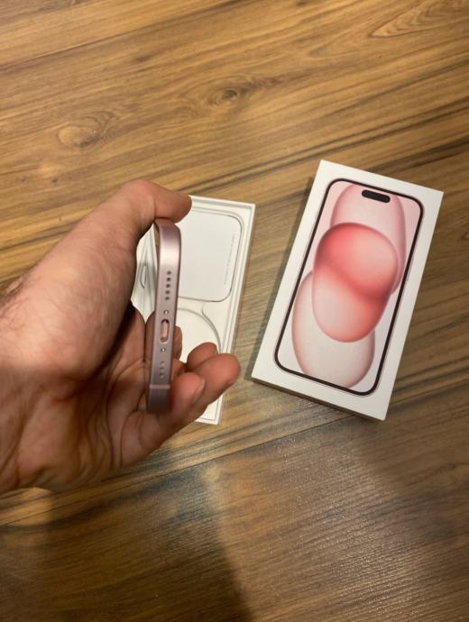 iPhone 15 (128 GB) v roza barvi. Kot nov, 97 % stanje baterije. Telefon je brez znakov uporabe.