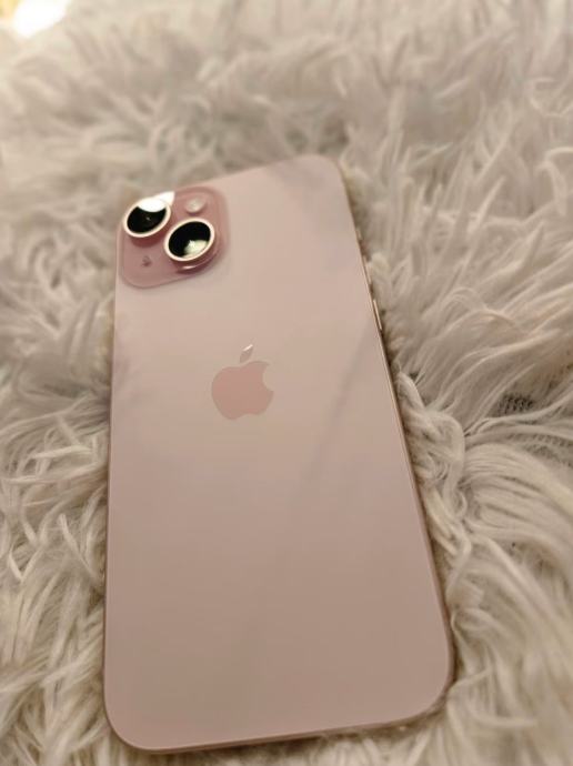 iPhone 15 roza barve, 128 GB, z zaščitnimi MagSafe etuiji in originalnimi dodatki – kot nov!