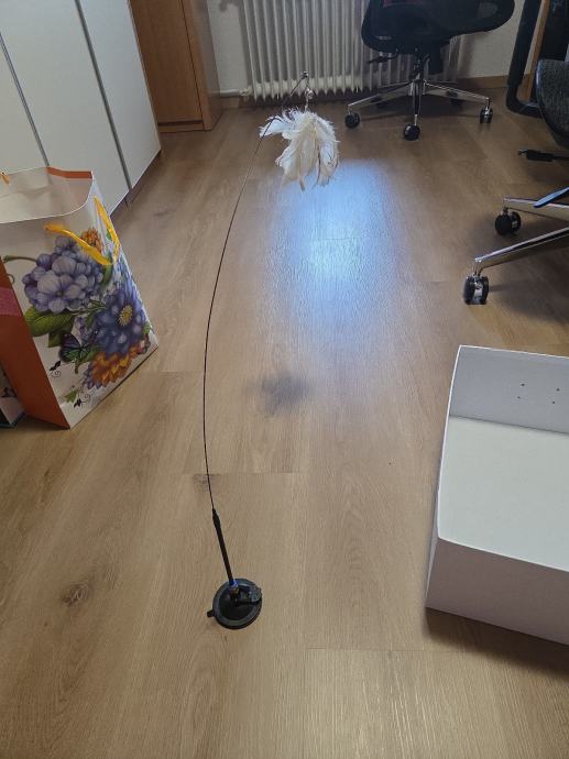 Mačja igrača s perjem se prisesa na tla z vakuumom in omogoča brezskrbno igranje mačke.