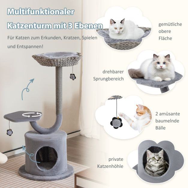 Večnamenski center za aktivnosti za mačke: 3-nivojski večnamenski mačji stolp je zasnovan z udobno zgornjo posteljo in zasebno mačjo votlino, ki zagotavlja razkošno izkušnjo spanja. Na voljo je tudi vrtljiva skakalna ploščad za počitek. Poleg tega ima priloženi 2 zabavni viseči žogi za še več zabave.