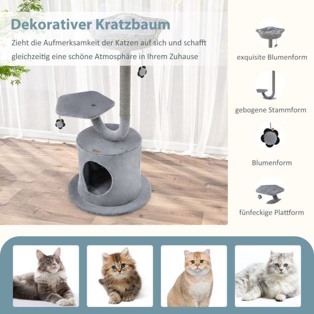 Eleganten videz: okrasno mačje drevo ima izvrstno ležalno površino v obliki rože, ukrivljen okvir v obliki debla, viseče krogle v obliki rože in peterokotno ploščad, ki pritegne pozornost mačk, hkrati pa ustvari čudovito vzdušje v vašem domu.
