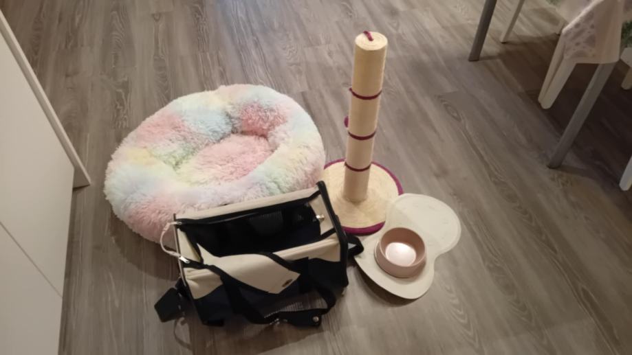 Prodam v kompletu novo nerabljeno ležišče, nov nerabljen mačji praskalnik, rabljen transporter za živali, podloga za posodice in posodico.