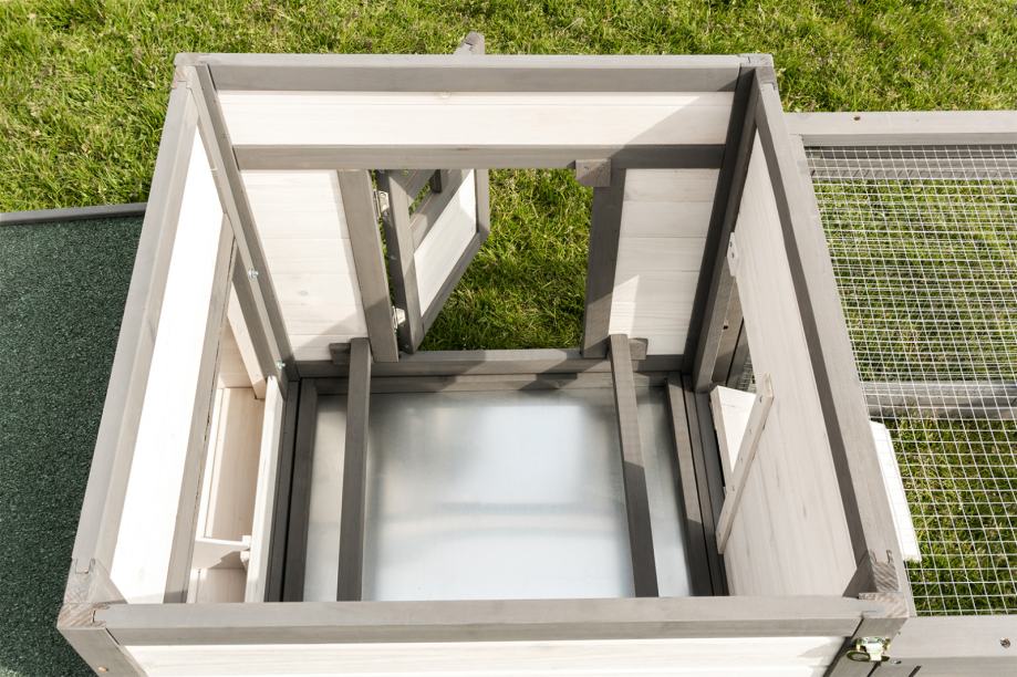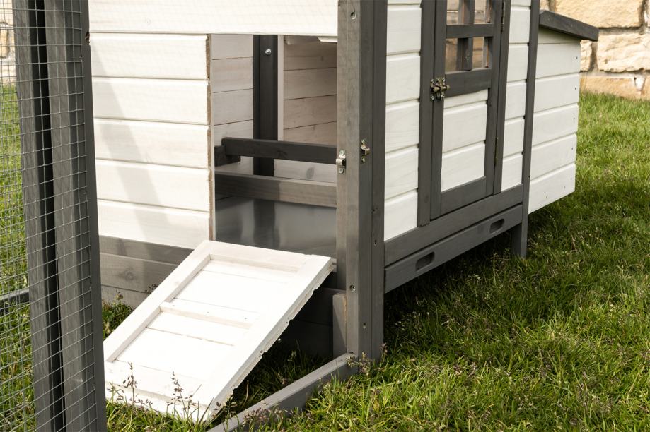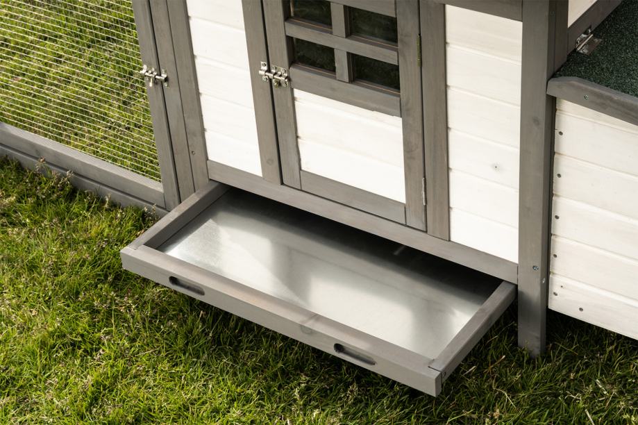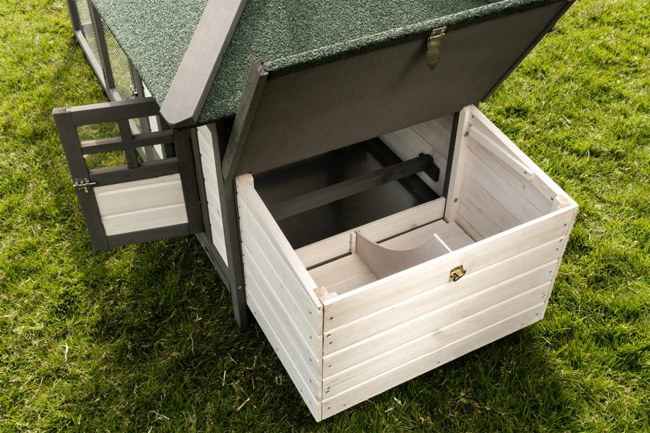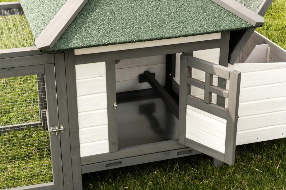 Vaše kokoši se bodo v tem kokošnjaku počutile popolnoma domače. Kokošnjak je zaradi svoje robustnosti izdelan iz masivnega, impregniranega borovega lesa. Vodoodbojna katranska papirna obloga na strehi zagotavlja, da v notranjosti ostane udobno suho, tudi ko močno dežuje. Rahlo dvignjen položaj preprečuje tudi, da bi se mraz in vlaga iz tal dvigala v kokošnjak. Stranska vhodna vrata vam omogočajo, da preverite, kaj je v kokošnjaku, druga vrata v notranjosti pa se zložijo in tvorijo klančino, ki vašim kokošem omogoča enostaven dostop do izpusta. Medtem ko je streha na notranji strani kokošnjaka snemljiva, je streho na gnezdilnici mogoče odpreti. To vam omogoča enostaven dostop do gnezdilnice in jajc v njej. Končno je čiščenje zaradi izvlečnega predala enostavno.