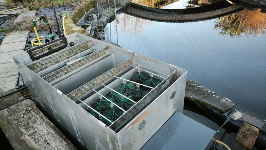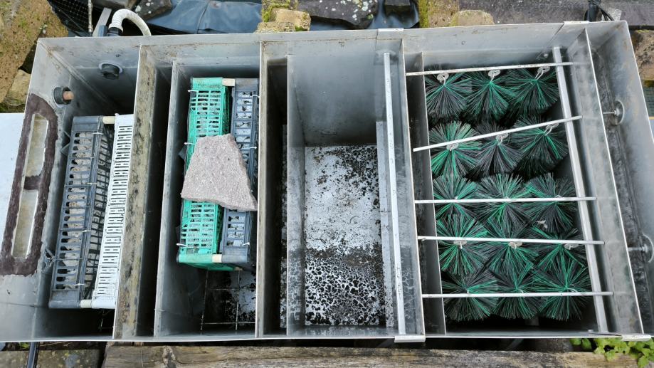 Filter za ribnik. Narejen je iz inoxa. Dolžina 1400mm, višina 800mm in širina 700mm..
