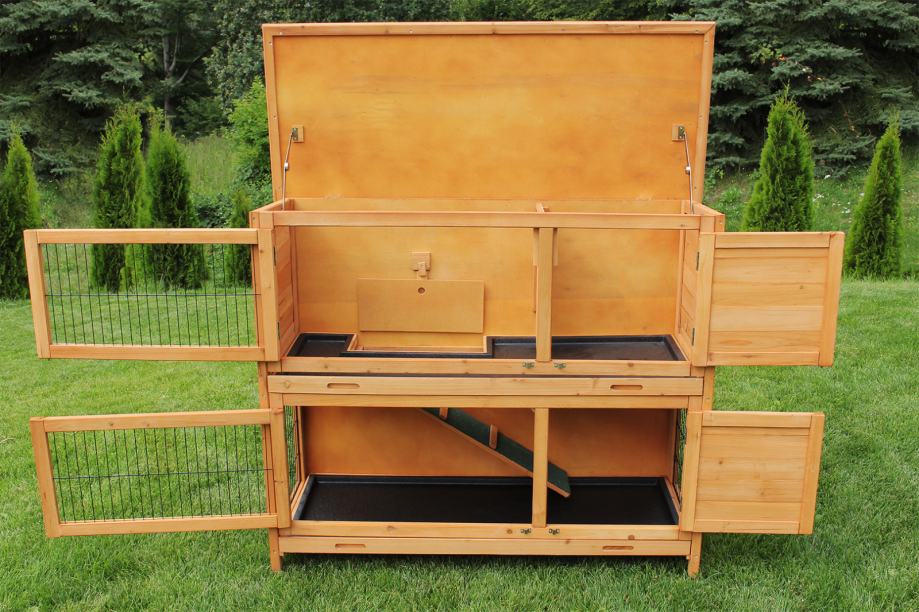 Se sprašujete, kako izgleda idealen dom za vašega ljubljenčka? Zajčnik nudi ljubljenemu dolgouhcu popolno mesto za dobro počutje! Zajčnik z dvema nadstropjema ima veliko prostora in veliko možnosti za umi. Zaradi vodoodbojne strehe in impregniranega lesa je zajčnik odporen tudi na vremenske vplive. Štiri vrata in streha, ki se odpira, omogočajo kadarkoli dostop do notranjosti dvonadstropne kletke. Tudi čiščenje je opravljeno v hipu – zahvaljujoč dvema izvlečnima predaloma.