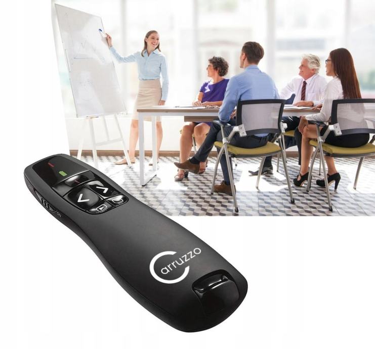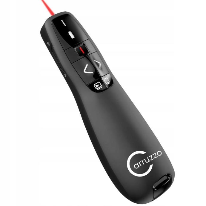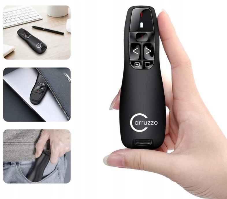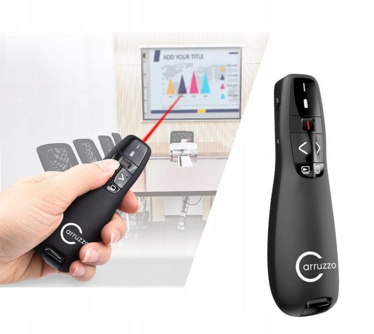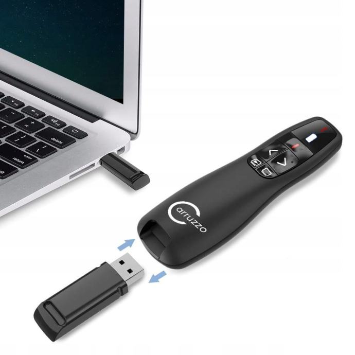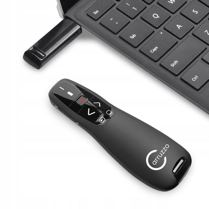 Radijski daljinski upravljalnik za upravljanje multimedijskih predstavitev / diaprojekcij z vgrajenim laserskim kazalcem.