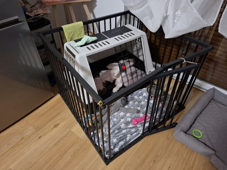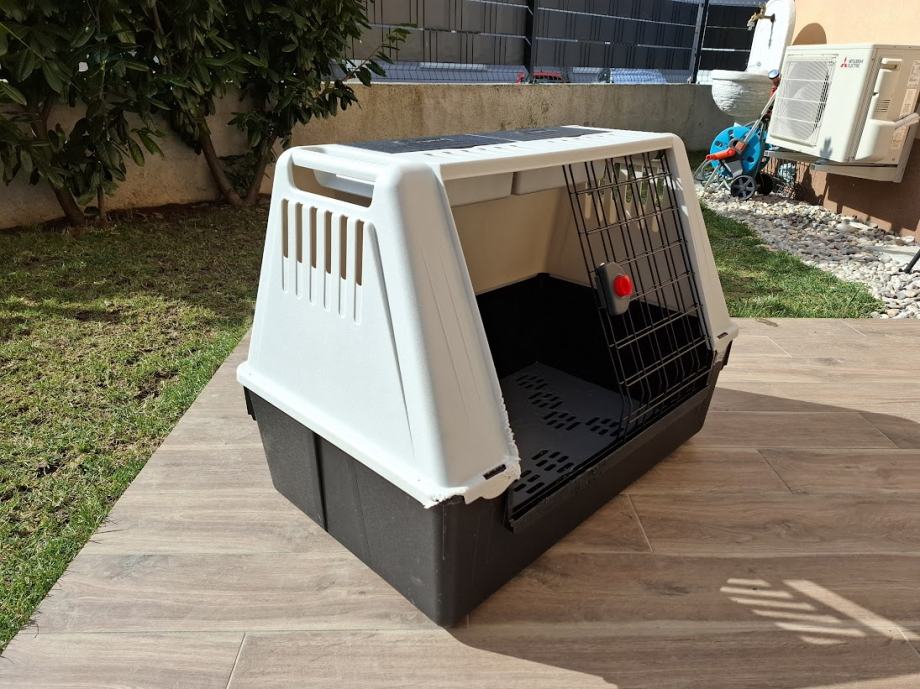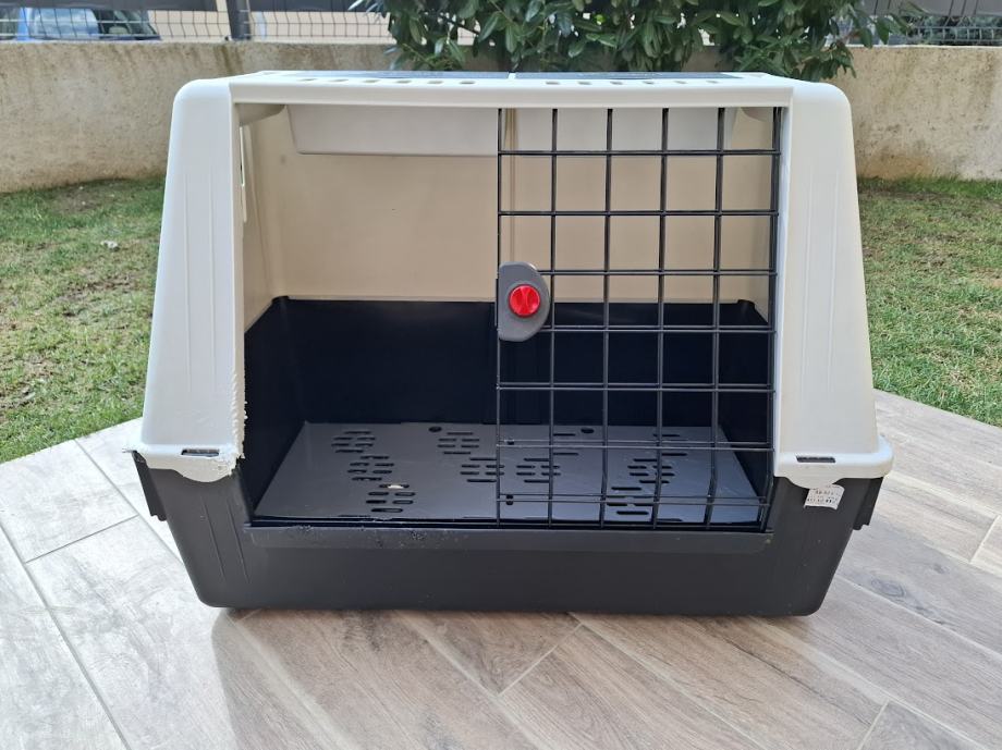 Prodam pasji box - viš: 62cm, dolžina: 83 cm, šir: 48 cm , ograjco, ki je lahko okoli boxa - 47 cm x 8 kom. (potrebno je zamenjati eno letvico), pasjo oprsnico in flexi povodec dolžine do 8 m (50 kg). Vse skupaj za 100 €.