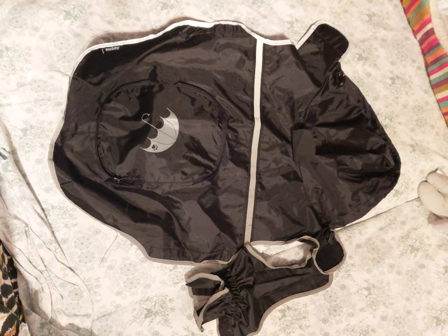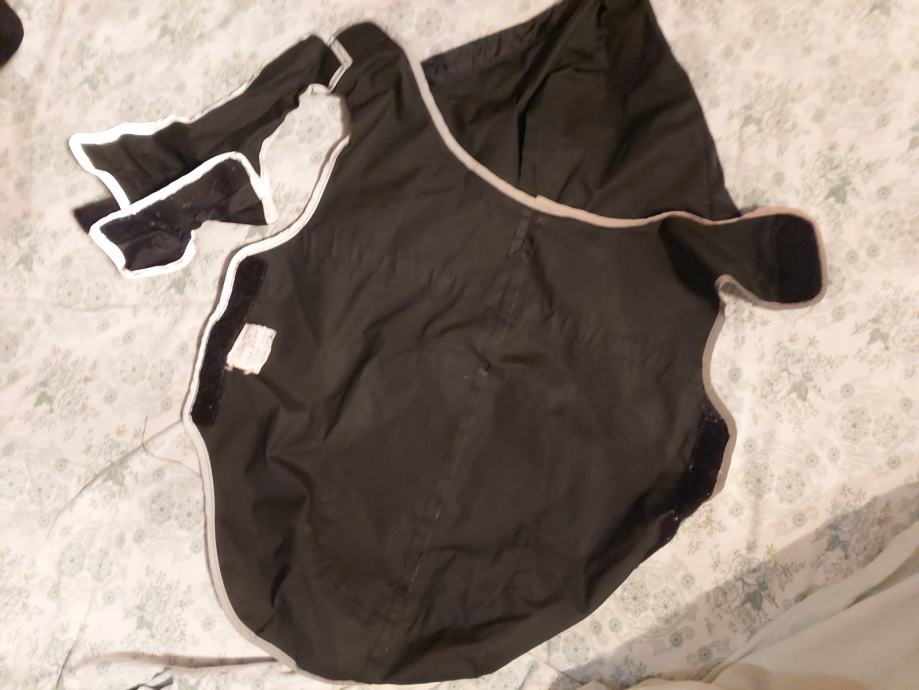 Prodam črni dežni plašček z odsevno obrobo - dolžina hrbta 40 cm + kapuca , obseg do cca 60 cm .
