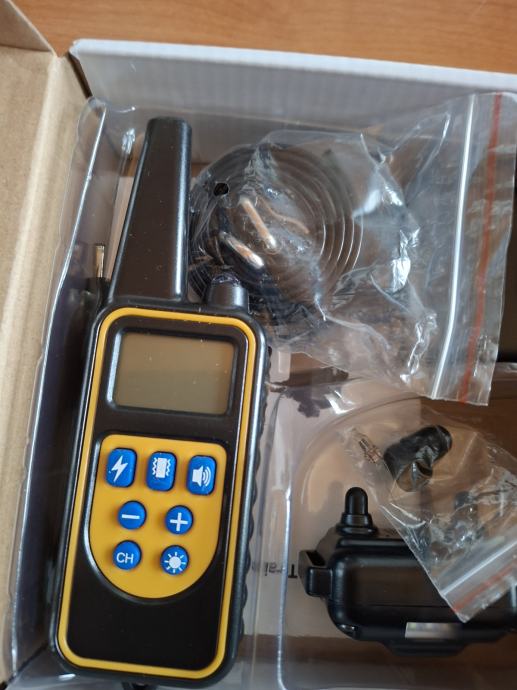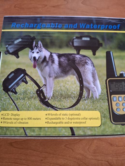 Pripomoček za šolanje psov z dometom 800 m.Polni se z adapterjem kot telefon, tako da ni potrebno kupovati dodatnih baterij.Ima vgrajeno ljonsko baterijo .Ima 3 funkcije za poklic vašega psa in sicer zvok, vibra in elektro.Oddajnik in daljinec se polnita istočasno s priloženim adapterjem.Napolnjena zdrži 4 do 5 dni.Po vsaki uporabi jo izključim.Na daljincu ima vgrajeno tudi lučko,da se lahko sprehajate tudi ponoči.Primerna je tudi za mokre deževne dni, za velike in majhne pse.Dolžina paska je 67 cm.
