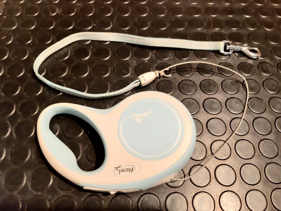 Prodam malo rabljen Flexi povodec S, dolžina vrvice 8 metrov, primeren za pse do 12 kg, v sivo svetlo modri barvi.
